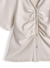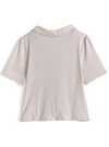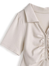 フロント部分にギャザーをたっぷりと寄せて立体感を持たせたトップス。スキッパーカラーにすることで顔まわりをすっきりと見せ、抜け感のある印象に。