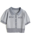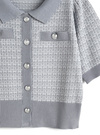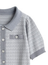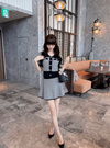 ほんのりきらめくラメを編み込んだツイード調ニットのセットアップが登場。きちんと感のある襟付きカーディガンがエレガントな印象を与える。