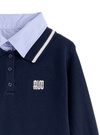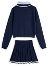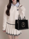 胸元のロゴ刺繍と配色ラインがプレッピーな印象を加えるセットアップ。トップスは異素材のポロ襟を重ねたようなレイヤードデザイン。
