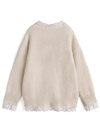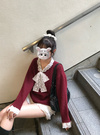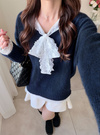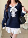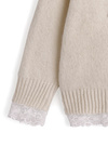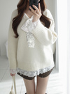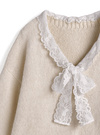 柔らかなニットにフラワーレースをドッキングしたデザイントップス。胸元のリボンが顔まわりを華やかに印象付けるポイント。