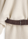 付属のワイドなスエード調ベルトでウエストマークすれば、細見え効果も期待できる。