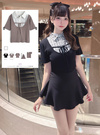 シャツとニットを組み合わせたようなドッキングデザインが特徴のトップス。襟デザインできちんと感を出しつつ、胸元にはリボンを添えてフェミニンさをプラス。