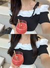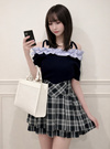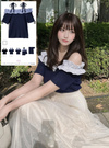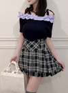 デコルテをきれいに見せるオフショルダー仕様のフェミニントップス。異素材フリルやリボンの肩紐が顔まわりをパッと華やかに印象付ける。