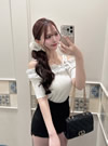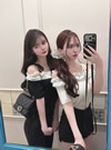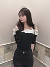 オフショルダーでデコルテをきれいに見せつつ、リボンの肩紐を添えて甘さをプラス。