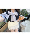 ボウタイブラウスとニットカーデを組み合わせたようなレイヤード風トップス。首元や袖口に印象的なリボンをあしらい、甘さたっぷりに仕上げたデザイン。