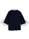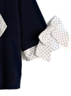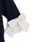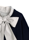 ドット柄のブラウスとニットカーデを組み合わせたようなレイヤード風トップス。首元のボウタイや袖口のリボンがフェミニンムードたっぷりなアクセント。