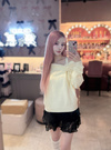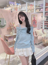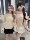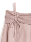 折り返しのオフショルデザインでレディな雰囲気を引き立てるトップス。片側にあしらったフェミニンなドロストリボンがアクセントに。