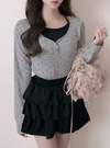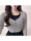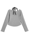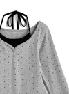 細かい水玉柄を散りばめたクラシカルな印象のトップスアイテム。中にホルターネックのインナーを重ね着しているようなレイヤード風デザインがこだわりポイント。