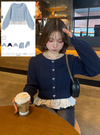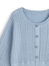 細かいケーブル柄の編み地で立体感を出したニットトップス。カーディガン風の仕様にキラキラのビジューリボンを並べたこだわりデザイン。