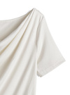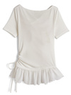 立体的で流れるようなドレープデザインが目を惹くきれいめトップス。裾にはシフォン素材のフリルをあしらい、華やかさをプラス。