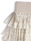 手触り滑らかなスエード調生地と、柔らかいレース素材を組み合わせたミニスカート。可憐なフラワーレースを3段にティアードした、ひらひら揺れ動くシルエットがとびきりキュート。