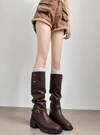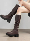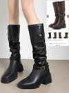 柔らかいフェイクレザーを使用した、程よくルーズ感のあるロングブーツ。ベルトモチーフがレトロな雰囲気を漂わせるアクセントに。