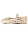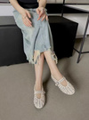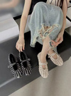 足元いっぱいに散りばめられたビジューが、歩く度に光を反射し存在感を放つ。エッジを効かせたベルトモチーフのストラップがクールな印象をプラス。