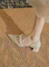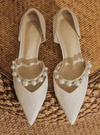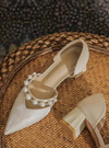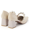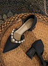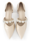 光沢のあるサテン調素材が上品で高見え間違いなしのパンプス。ストラップ部分にサイズの違うパールを贅沢にあしらうことで、よりエレガントなルックスに仕上げた。