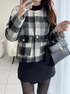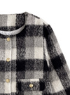 優しげなシャギー素材のチェック柄が目を引くジャケット。フロントのゴールドボタンが上品に輝き、羽織るだけできちんと感をプラス。