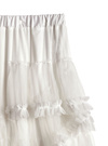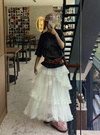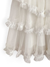 ふんわりと広がるチュールをたっぷり重ね、エアリーな雰囲気に。裾まで贅沢にあしらわれたティアードフリルが動きに合わせて揺れる。