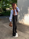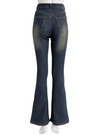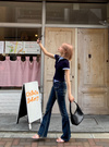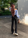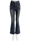 ベーシックなフレアパンツにフラップポケットをプラスして、シンプルトップスと合わせても映えるデニムパンツ。レッグラインに優しくフィットするので脚を細くきれいに見せてくれる。