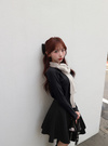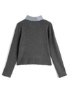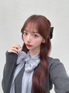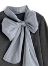ベーシックなリブニットに異素材リボンをドッキングしたクラシカルなトップス。やや光沢のある大きめリボンが、顔周りを華やかに演出。