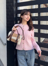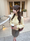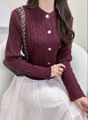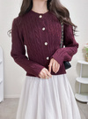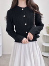 立体感のあるケーブル編み地が特徴のニットカーディガン。コールドのデザインボタンが華やかな雰囲気を演出するポイント。