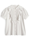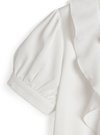 柔らかいシフォン生地に胸元のラッフルやピンタックが清楚な雰囲気のブラウス。細めリボンや袖のパフ感も相まって女の子っぽさの詰まった一枚。