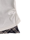 シンプルなカットソーにチェック柄のシアー素材を重ねたレイヤード風トップス。ネックラインやウエスト部分の片側のみにギャザーを寄せたアシンメトリーデザインが、こなれた雰囲気を醸し出す。