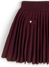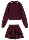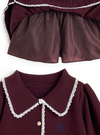 程よい厚みのニット素材で仕立てた、カーディガンとプリーツスカートのセットアップ。襟や前立てに施されたレーストリムが、上品で可憐な印象を与える。