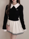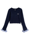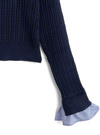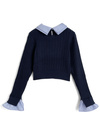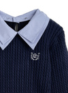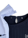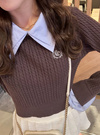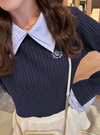 細かいケーブル編みニットに胸元のロゴ刺繍がクラシカルな印象のプルオーバー。シャープなダブルカラーは取り外しができるので、ノーマルなトップスとしても着まわせる。