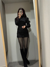 裾のシャーリングが印象的で視覚的にアクセントの効いたワンピース。タートルネックで全体のバランスを整えつつ、モードな装いに。
