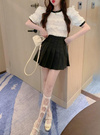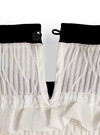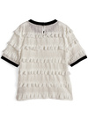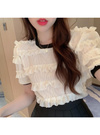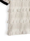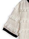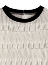 透け感のあるニュアンス柄の生地にフリルを重ねたエレガントなトップス。ネックや袖口に施した配色リブデザインが甘すぎない雰囲気に。