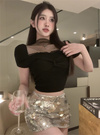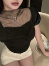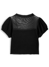 さらりとした薄手ニットに異素材のシアーを組み合わせたトップス。