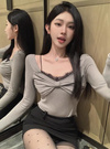 レースキャミソールを重ね着したようなつくりでレディなムードのトップス。フロントに施した大きなリボンモチーフが乙女心をくすぐる。