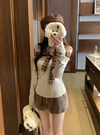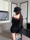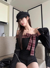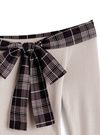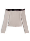 チェック生地の折り返しデザインとリボンがアクセントになった、フェミニンさたっぷりのトップス。オフショルダー仕様でデコルテをきれいに見せ、抜け感のある印象をプラス。
