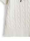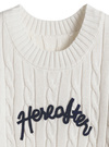 細かいケーブル編みに筆記体の配色ロゴがアクセントのニットトップス。短すぎない袖の丈感が適度に二の腕をカバー。