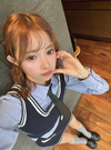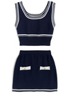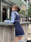 配色ラインの入ったベストとタイトスカートを合わせることで、スクールライクなコーデが完成する。