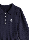 縦ラインを際立たせるケーブル編みニットが、すっきりとした印象を与える。ポロシャツ風の襟とボタンディテールで、程よくカジュアルダウンされた作り。