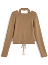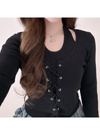 ホルターネックのインナーをレイヤーしているような仕様のこなれトップス。フロントのレースアップリボンが視線を集めるアクセントに。