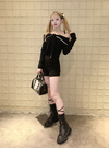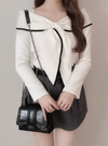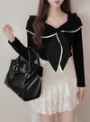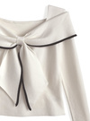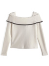 リボンのようなカラーデザインが目を惹く、クラシカルな印象のトップス。肩からずり落ちたり下着の紐が見えづらい、オフショルダー風のデザイン。