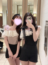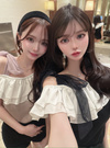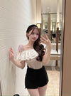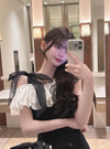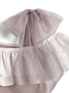 ネックラインに異素材フリルをドッキングしたワンショル仕様のトップス。肩にチュールリボンを添えることで、ガーリームードたっぷりに仕上げた。