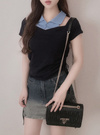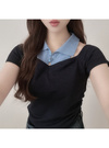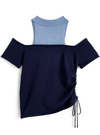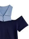 さらりとしたカットソーライクなニット地で、ボディラインに優しく馴染む。オフショルダーにポロ襟をレイヤードしたデザインが、洗練された個性をメイク。