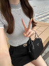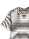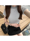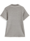 リブの立体感が映える、さらっと着られるボーダー柄半袖ニットトップス。高めのネックラインが顔まわりを引き締め、上品なニュアンスをオン。