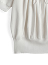 ドロストでぎゅっと寄せたギャザーがバストラインをふんわり見せてくれる。なめらかなサマーニットなので暑い時期でも快適で、きちんと感も崩さない。