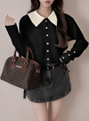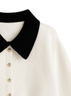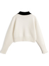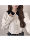 配色襟がクラシカルな印象を与えるニットカーデガン。裾や袖のリブ切り替えがメリハリのあるルックスに。