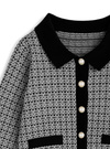 トップスは配色の襟とパール調ボタンでクラシカルな雰囲気に仕上げた。