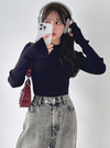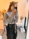 スッキリとしたクルーネックでネックレスやチョーカーなどのアクセサリーも映える。