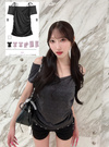 ラメが織り込まれた伸びやかな素材が、繊細な輝きを添えるトップス。