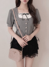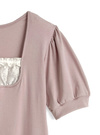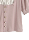 繊細なレースがチラリと覗く、レイヤード風のデザイントップス。フロントのリボンディテールやパールボタンがクラシカルな印象に。