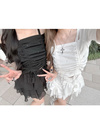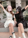 リブ素材を使用し、フィット感のあるシルエットに仕上げたオフショルダートップス。フロントのドロストデザインで丈感やボリューム調整ができ、好みのシルエットにアレンジできる。