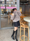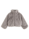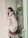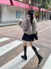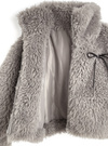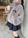 モコモコのボア素材で仕立てたボリューム感たっぷりのジャケット。フロントにはフェイクレザーのリボンをあしらい、ガーリーなアクセントを効かせた。