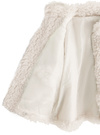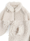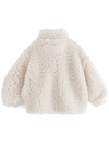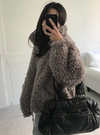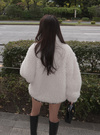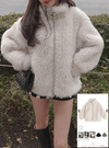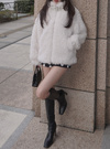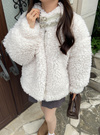 羊のようなモコモコのエコファーで仕立てた、ボリュームたっぷりのジャケット。ベルトデザインのスタンドネックがスタイリッシュな雰囲気を演出。