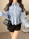 マルチストライプ柄生地で仕立てた爽やかな印象の上品なブラウス。身頃部分にシャーリングを施すことで、ボディにフィットした女性らしいシルエットをメイク。